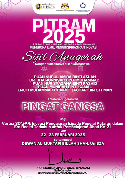 KUALA TERENGGANU, 23 Februari 2025 – PITRAM 2025 yang berlangsung di Universiti Sultan Zainal Abidin(UniSZA) merupakan Pertandingan Inovasi Antara Asasi Malaysia 2025 yang dilaksanakan pada setiap tahun. Unit Matematik ASPutra telah menghantar satu pasukan bagi menyertai perrtandingan ini. Pasukan yang diketuai oleh Puan Nurul Amira Aslan turut disertai oleh lagi 4 orang ahli iaitu Dr. Khairunnisak Muhammad, Puan Nur Syazana Rashid, Puan Munirah Kamal dan Encik Muhammad Khairul Jauhari Othman.