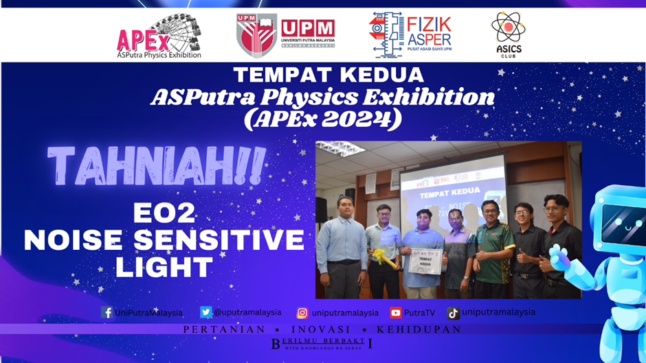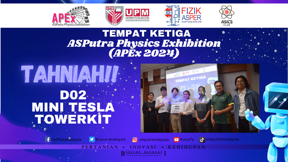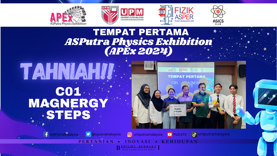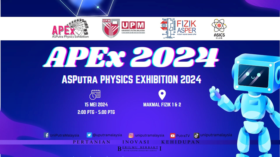 15 Mei 2024 – Program ASPutra Physics Exhibition 2024 (APEx2024) anjuran Kelab Fizik ASPutra (ASICS) dengan kerjasama unit Fizik, Pusat Asasi Sains Universiti Putra Malaysia telah diadakan. Penganjuran APEx2024 adalah usaha untuk memberikan impak yang tinggi dalam budaya penciptaan, inovasi dan kreativiti dalam bidang fizik terutama dalam kalangan pelajar ASPutra sejajar dengan transformasi pendidikan kebangsaan yang kini memberi tumpuan kepada kepentingan pendidikan dalam Sains, Teknologi, Kejuruteraan dan Matematik (STEM) bagi melahirkan modal insan yang sangat mahir dan inovatif. APEx merupakan platform bagi pelajar untuk menyalurkan buah fikiran baharu yang cemerlang berkaitan dengan sains fizikal terutamanya dalam konsep mekanik, gelombang, terma, elektrik dan elektromagnet serta untuk menunjukkan ciptaan kreativiti mereka.